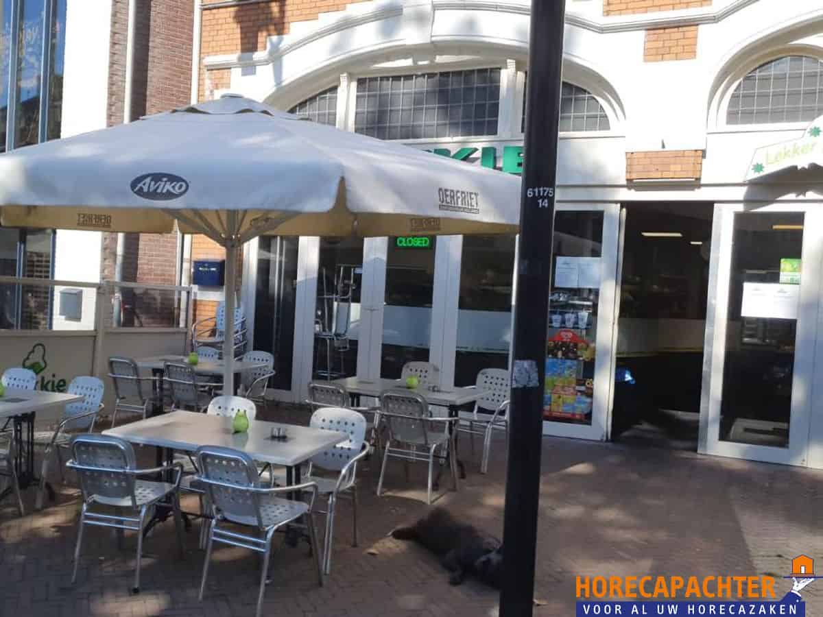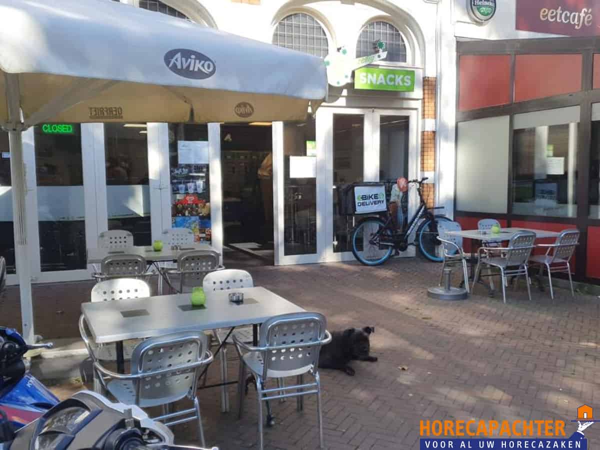 Aan de voorzijde is een mooi ruim terras met nu 24 zitplaatsen. Er is echter voldoende mogelijkheid om dit nog uit te breiden.