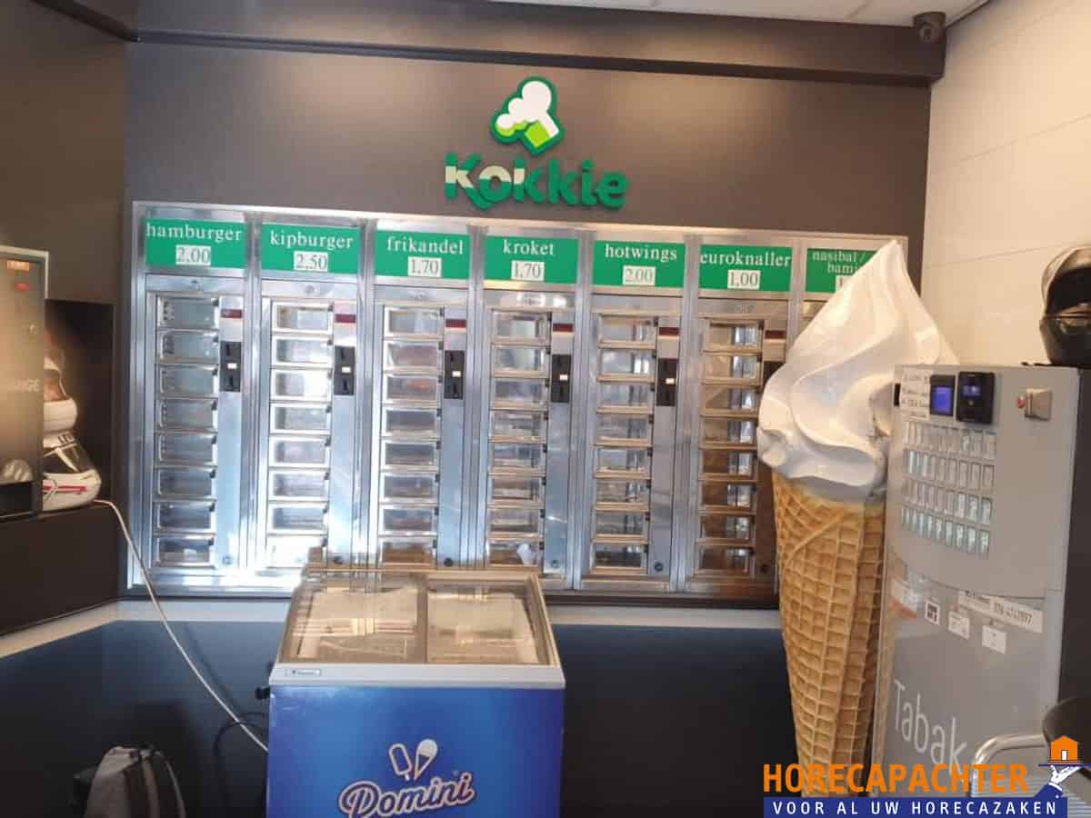 Entree met links een grote verkoopcounter. Achterin een grote muur met snackautomaten.