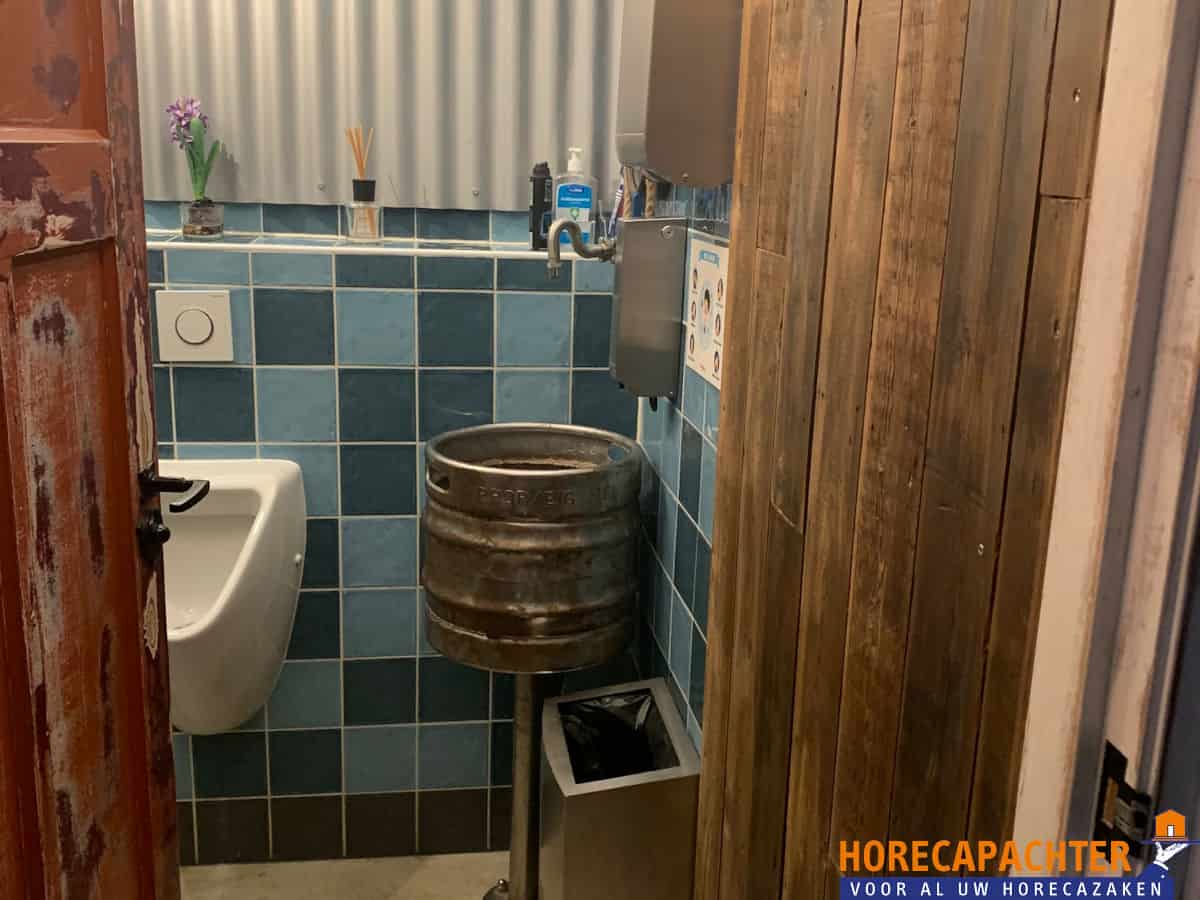 Links een splitlevel met onderin de prachtig ontworpen toiletten en de keuken. Boven een 15-tal zitplaatsen. Tevens de doorgang naar de hogere verdieping welke momenteel gebruikt wordt als woning.